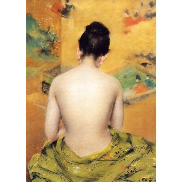 Back of a Nude, also known as Study of Flesh Color and Gold is a famous oil painting, originally by American artist William Merritt Chase in 1888, with the style of impressionism. The painting now is collected by private as collection. This kind of nude oil paintings is very common in visual art. Besides, recommend you to view other painting artworks from William Merritt Chase.