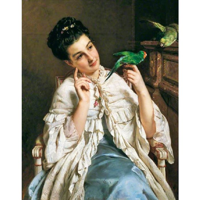 Girl with Lovebirds is one of the famous paintings created by the French artist Henri-Guillaume Schlesinger in 1876. This masterpiece now is located in Mercer Art Gallery where you can go for a visit with your family and have a look in person. Many art lovers like artworks with the style of Academism. If you are not familiar with Academism, it will be much easier for you to understand after you view more paintings with the style on our website.