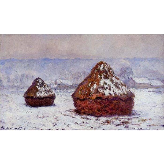 Own a museum-quality reproduction painting of "Grainstacks, Snow Effect" on artist-level linen canvas, originally by artist Claude Oscar Monet, year 1891. The oil painting will be replicated by a professional artist. You can freely select a size and a frame. If you want to order a size unlisted, please feel free to contact us.