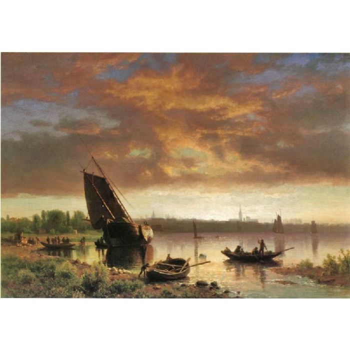 Own a museum-quality reproduction oil painting of "Harbor Scene(also known as potential)" on artist-level linen canvas, originally by artist Albert Bierstadt, year 1869. The painting will be replicated by a talented artist. You can freely select a size and a frame. If you want to order a size or a frame unlisted here, please feel free to contact us.