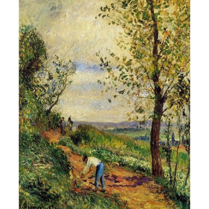 Own a museum-quality painting reproduction of "Landscape with a Man Digging" on artist-level linen canvas, originally by artist Camille Pissarro, year 1877. The oil painting will be replicated by a professional artist. You can freely select a size and a frame. If you want to order a size unlisted, please feel free to contact us.