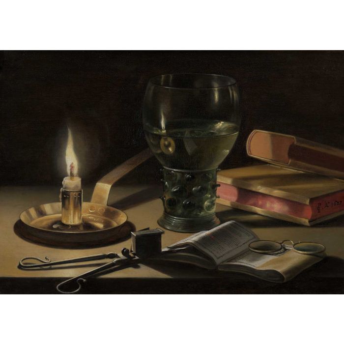 You can own a museum-quality handmade art reproduction of "Still life with a burning candle" by artist Pieter Claesz in 1627. The oil painting will be reproduced on artist-level linen canvas by an expert painter. Below you can select from multiple sizing options and top quality art frames. It is fully customizable.