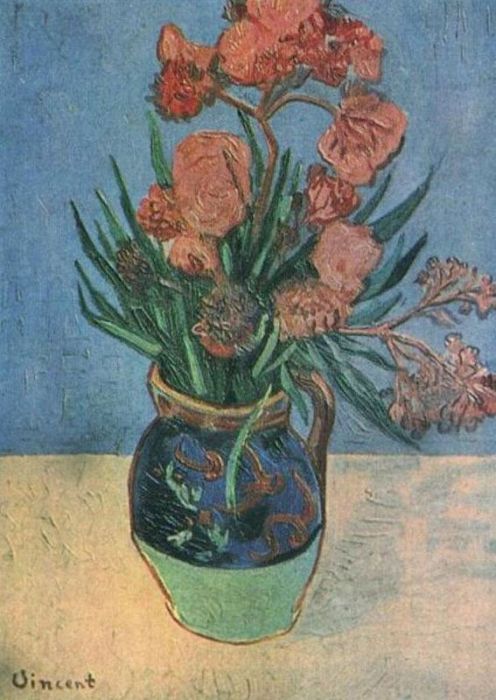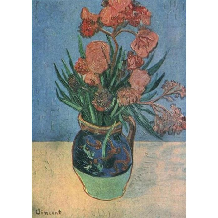 Vase with Oleander is a famous oil painting, originally by Dutch artist Vincent van Gogh in 1888, with the style of post-impressionism. The painting now is collected by unknown person or gallery. This kind of floral oil paintings is very common in visual art. Besides, recommend you to view other painting artworks from Vincent van Gogh.