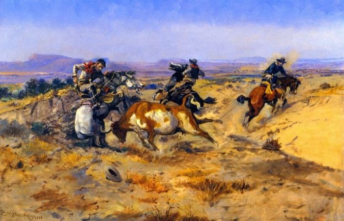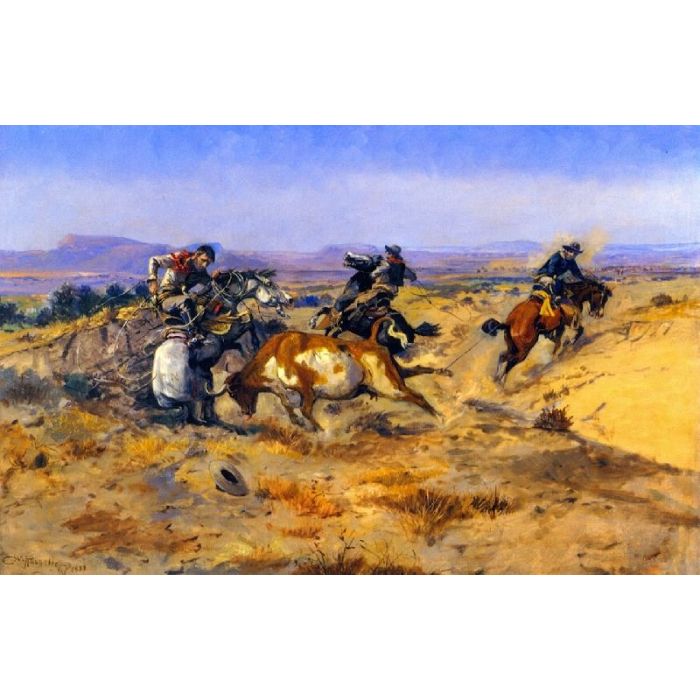Own a museum-quality reproduction painting of "When Cowboys Get in Trouble, also known as The Mad Cow" on artist-level linen canvas, originally by artist Charles Marion Russell, year 1899. The oil painting will be replicated by a professional artist. You can freely select a size and a frame. If you want to order a size unlisted, please feel free to contact us.