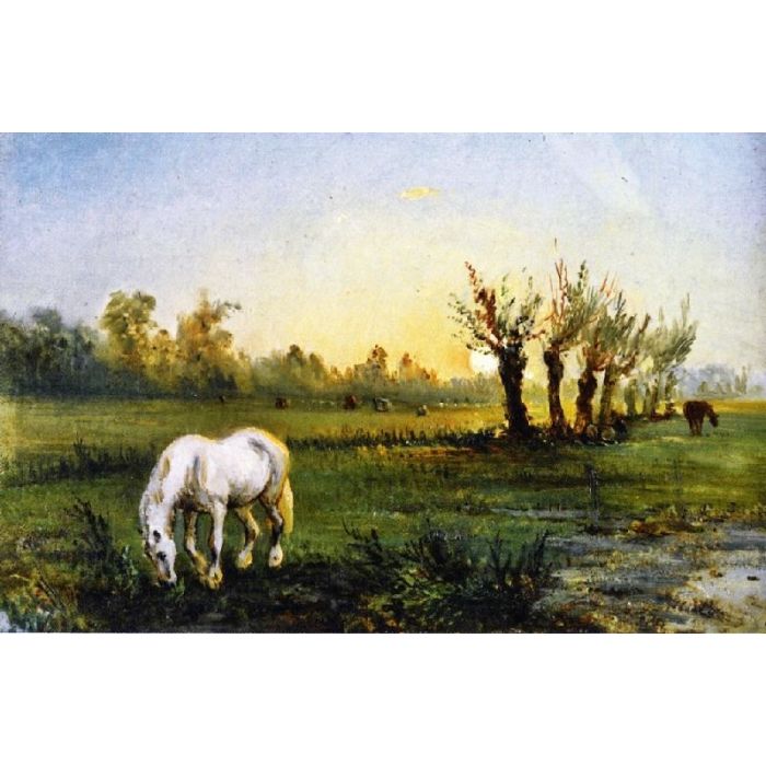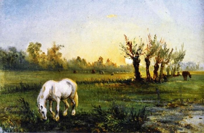 White Horse in a Meadow is a famous oil painting, originally by French artist Camille Pissarro in 1856, with the style of impressionism. The painting now is collected by private as collection. This kind of animal oil paintings is very common in visual art. Besides, recommend you to view other painting artworks from Camille Pissarro.