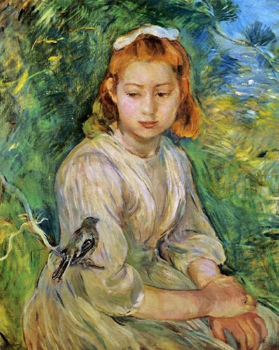 Young Girl with a Bird is a famous oil painting, originally by French artist Berthe Morisot in 1891, with the style of impressionism. The painting now is collected by private as collection. This kind of portrait oil paintings is very common in visual art. Besides, recommend you to view other painting artworks from Berthe Morisot.
