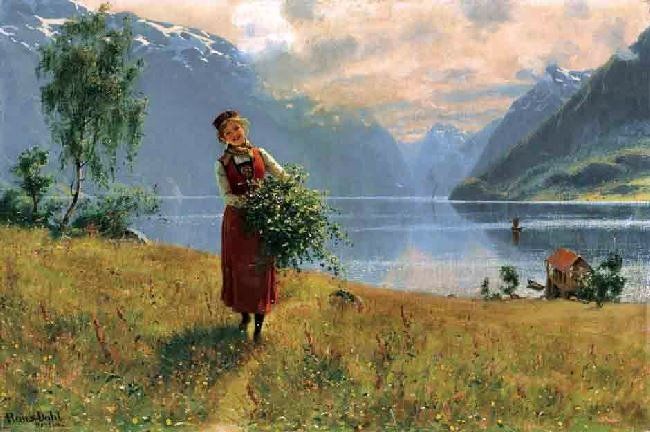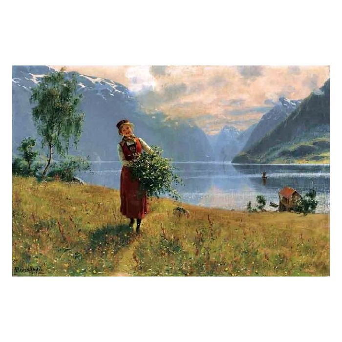 Own a museum-quality oil reproduction of "Young Girl with Birch Twigs in Front of a Norwegian Fjord" on artist-level linen canvas, originally by artist Hans Dahl, year 1900. The oil painting will be replicated by a professional artist. You can freely select a size and a frame. If you want to order a size unlisted, please feel free to contact us.
